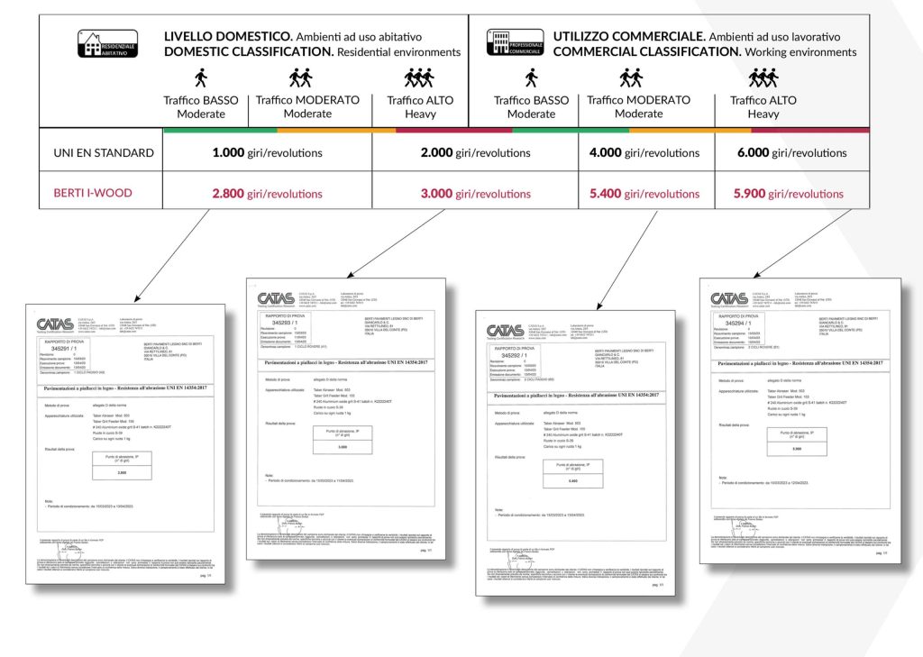 Tutti i test superati, certificano un prodotto ad alto traffico e un’alta resistenza all’abrasione, come da normativa UNI EN 14354:2017.  Un pavimento e rivestimento in vero legno, quindi, ideale per qualsiasi tipo di ambiente, dal residenziale al pubblico.